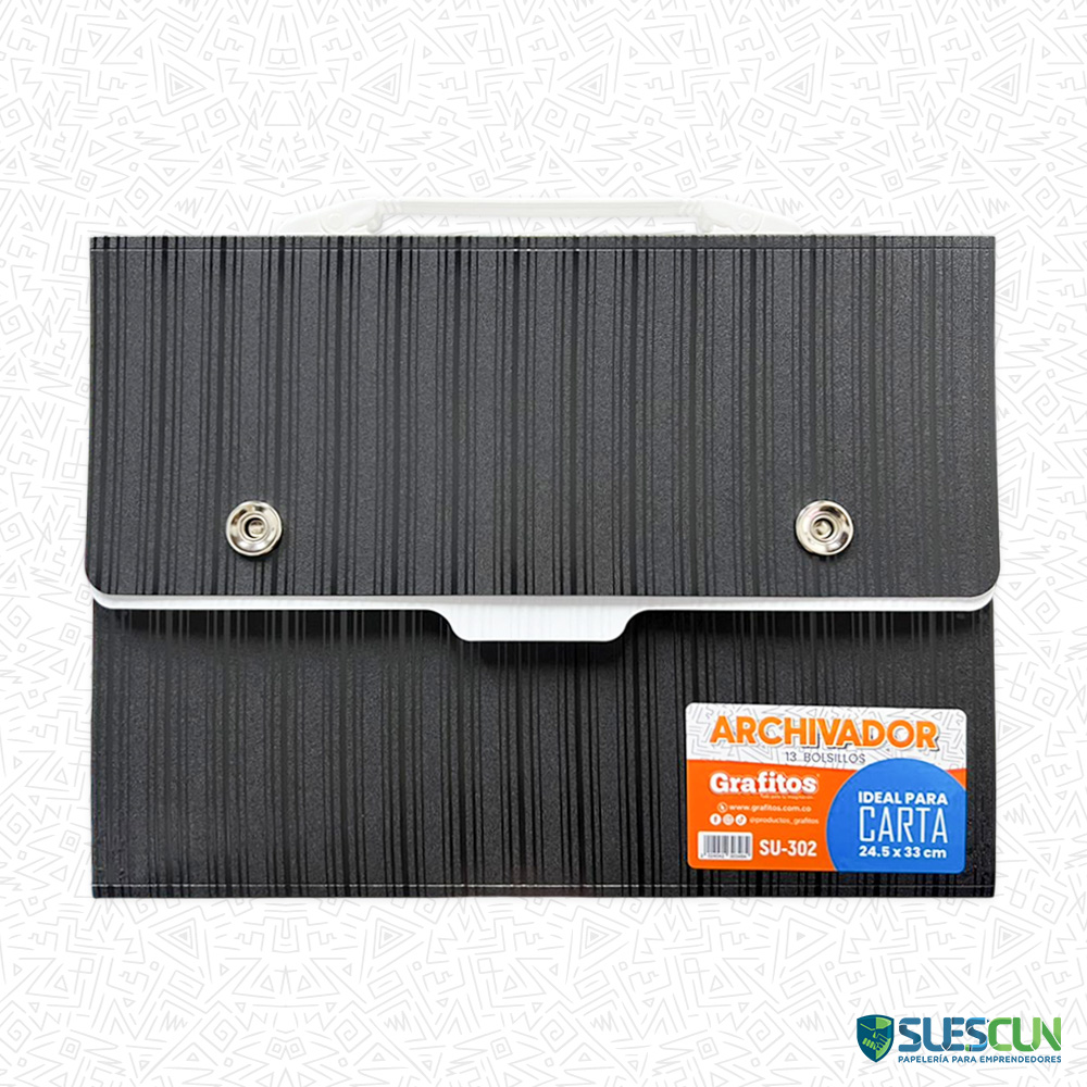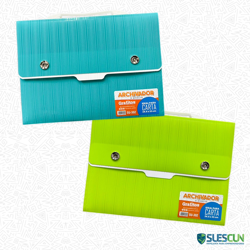 El Archivador 13 Bolsillos Carta SU-302 es perfecto para mantener tus documentos organizados, protegidos y fáciles de encontrar. Su diseño tipo acordeón con 13 bolsillos te permite clasificar por materias, temas o categorías, siendo ideal para colegio, oficina, archivos administrativos y emprendimientos.