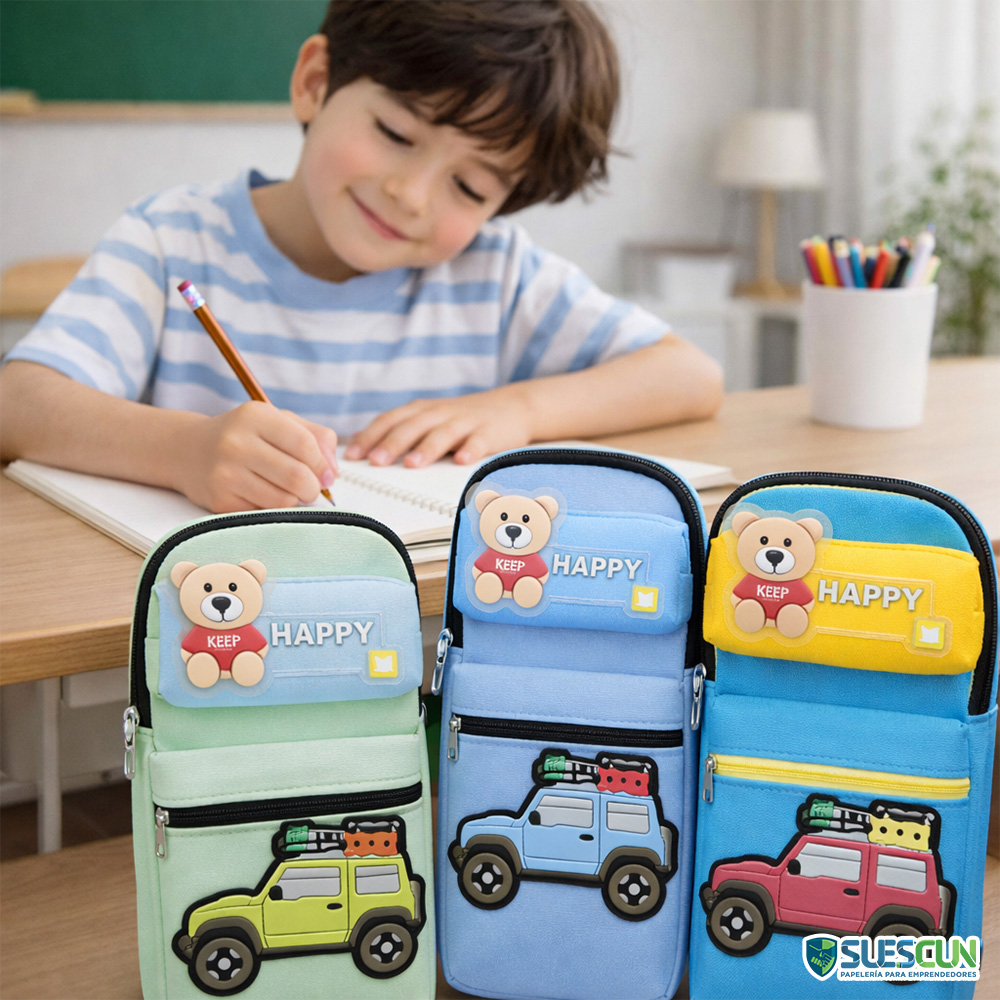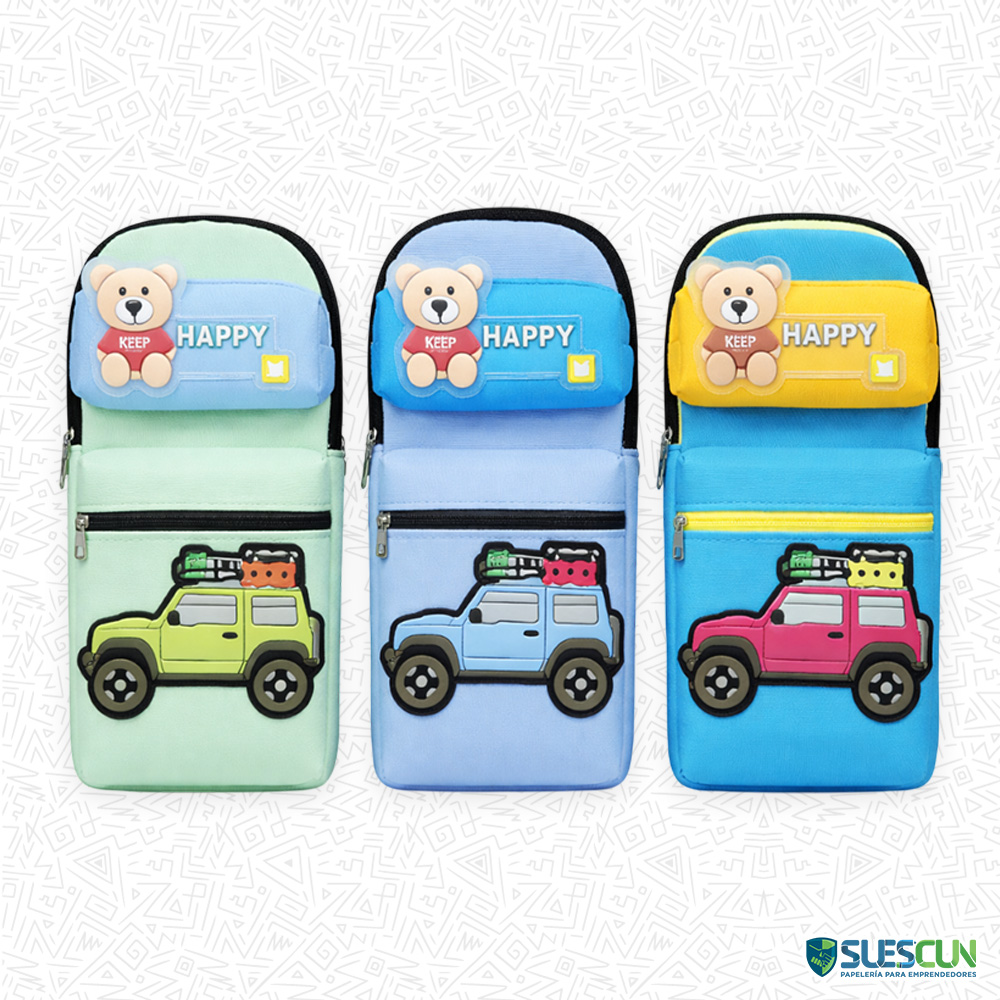 La Cartuchera Carrito Happy 2 Cierres es ideal para niños que aman los carros y quieren llevar sus útiles escolares con un diseño divertido y llamativo. Cuenta con un diseño tipo “Happy” con detalle de osito y un carrito en relieve 3D, que le da un estilo único y súper atractivo.