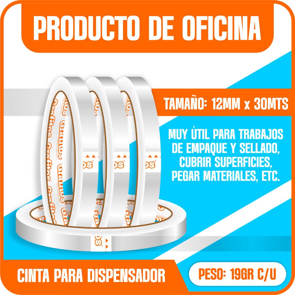 Cada dispensador permite un corte fácil y preciso de la cinta, evitando desperdicios y optimizando su uso. Su diseño ergonómico facilita su manipulación, brindando comodidad en cada aplicación. Además, la cinta es transparente, lo que permite una adhesión discreta y limpia en diferentes superficies, sin alterar la estética del material.