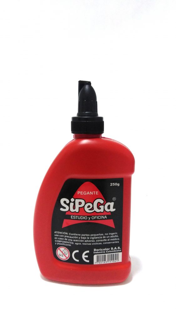 Pegamento líquido blanco, marca SIPEGA, es un pegante de uso escolar, no emite olores fuertes, lavable.