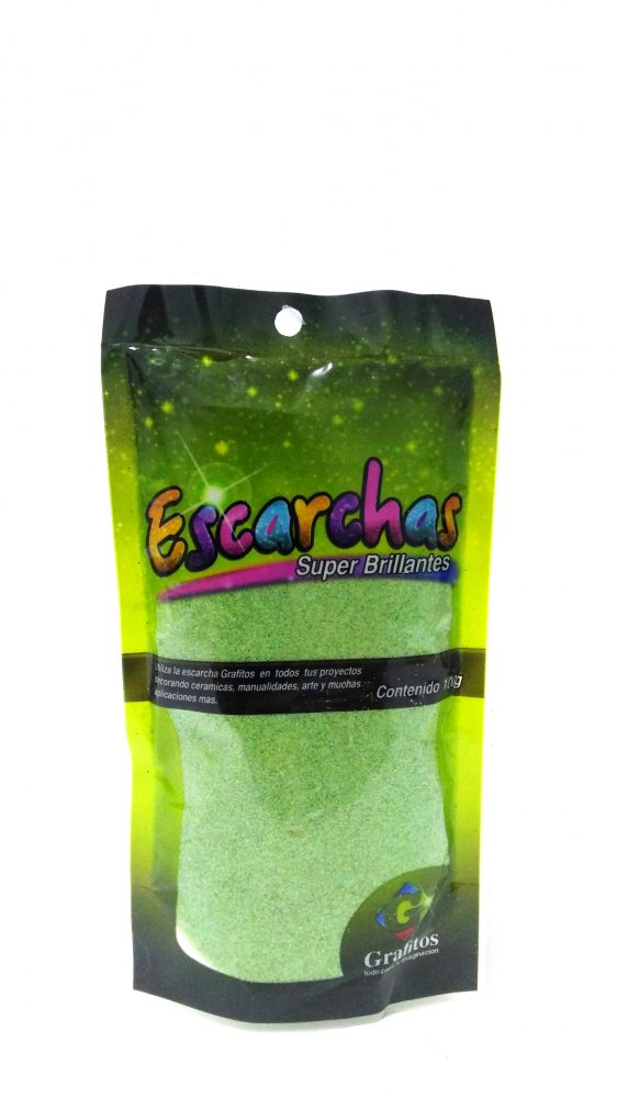 Paquete de 100 gramos de escarcha tornasol verde biche útil para los trabajos escolares, artísticos, decoraciones y manualidades.