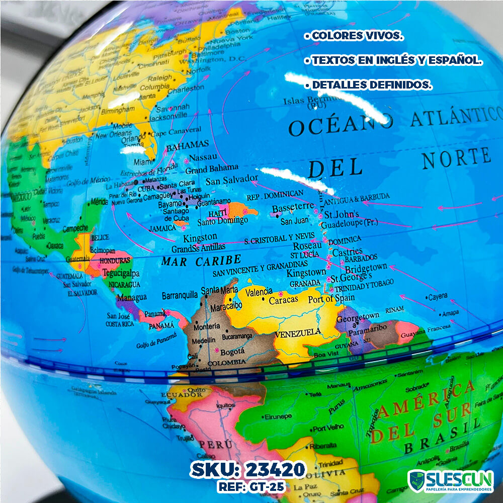 Este Globo Terráqueo Grande cuenta con textos en inglés y español, lo que facilita el aprendizaje bilingüe y lo convierte en una herramienta ideal para estudiantes, profesores y entusiastas de la geografía. Además, sus detalles bien definidos permiten ubicar con claridad países, capitales y regiones del mundo.
