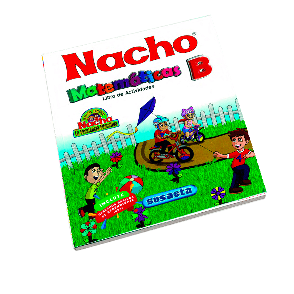 Con Nacho matemáticas B, los niños aprenderán y reforzaran el conteo de los números, la recta numérica hasta 100, completaran patrones de mayor complejidad y crearan los propios, sumas y sus propiedades, restas de 1 a 3 dígitos, operaciones mixtas, sumas y restas de mas de 3 dígitos, unidades, decenas y centenas. Conversión de números hasta el millar, en el área de geometría seleccionará figuras de dos dimensiones, comprenderá el concepto de lados, vértices y figuras tridimensionales. Medidas y posiciones de los objetos medición con reglas y termómetros, Fracciones simples y equivalentes, iniciación en operaciones matemáticas (multiplicación y división), probabilidades de mayor dificultad.