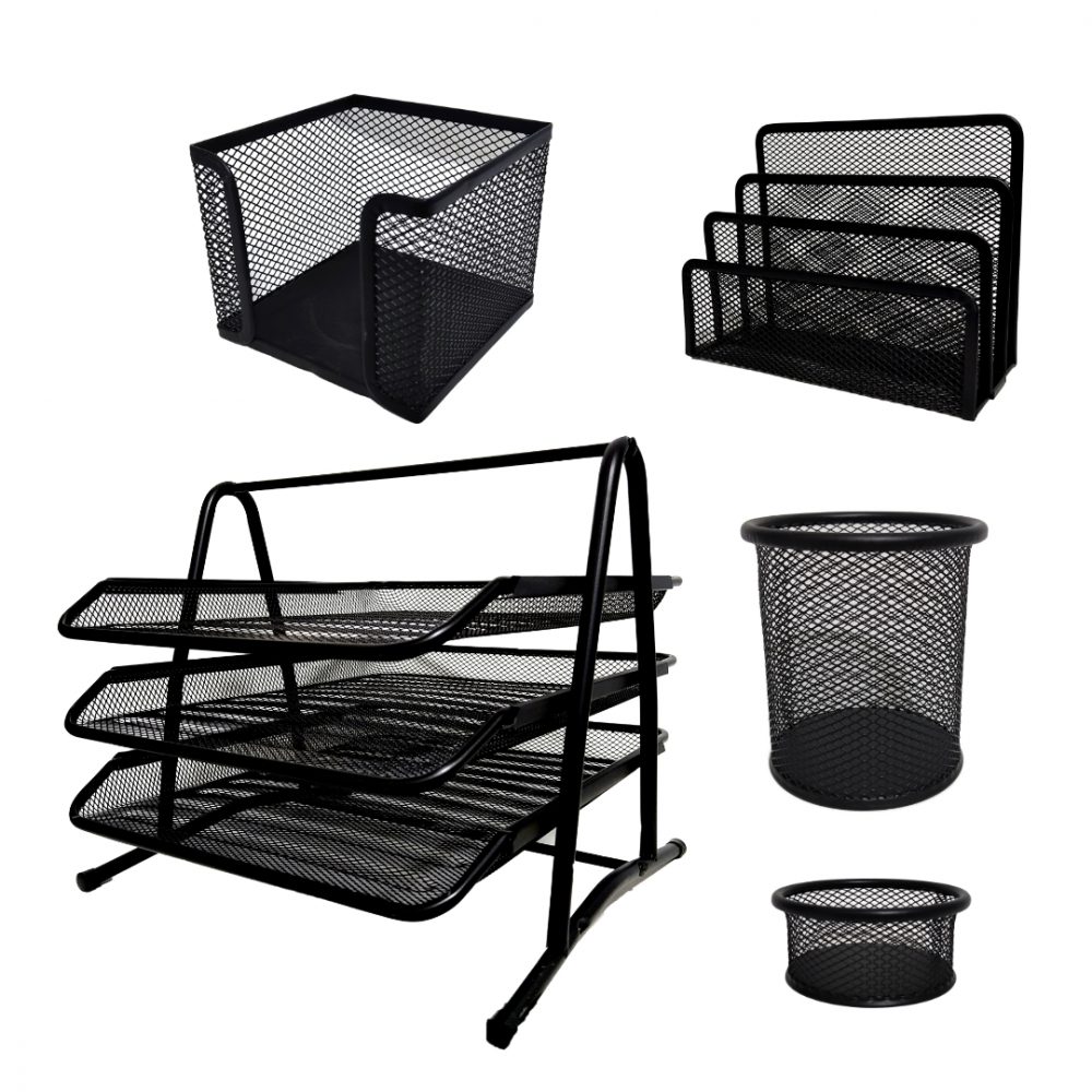 Contiene: 1 bandeja para documentos de tres niveles, 1 estante organizador de cartas, 1 porta lápiz, 1 porta memos, 1 porta clip o chinches.
