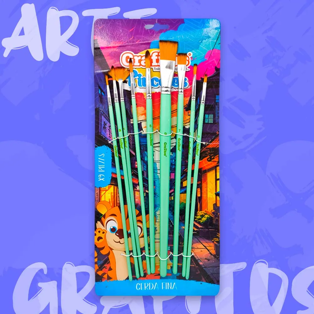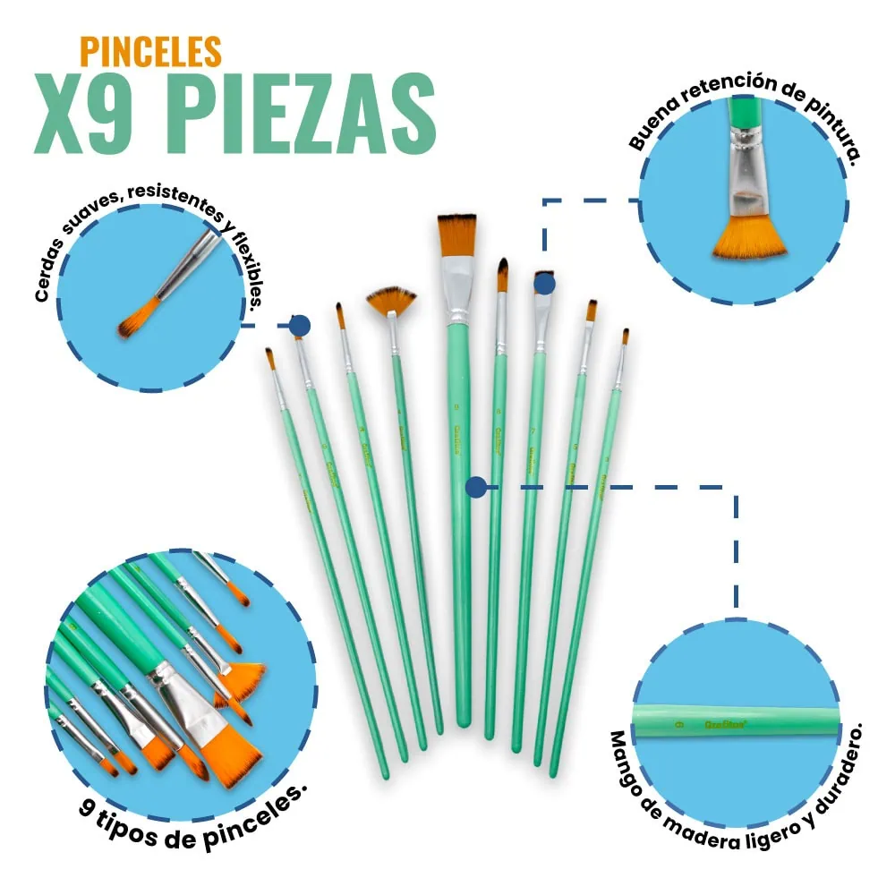 Este set incluye 9 pinceles de distintos tamaños, adaptados a diversas técnicas y estilos. Las cerdas suaves, resistentes y flexibles permiten trazos precisos y uniformes, asegurando resultados profesionales en cada proyecto.