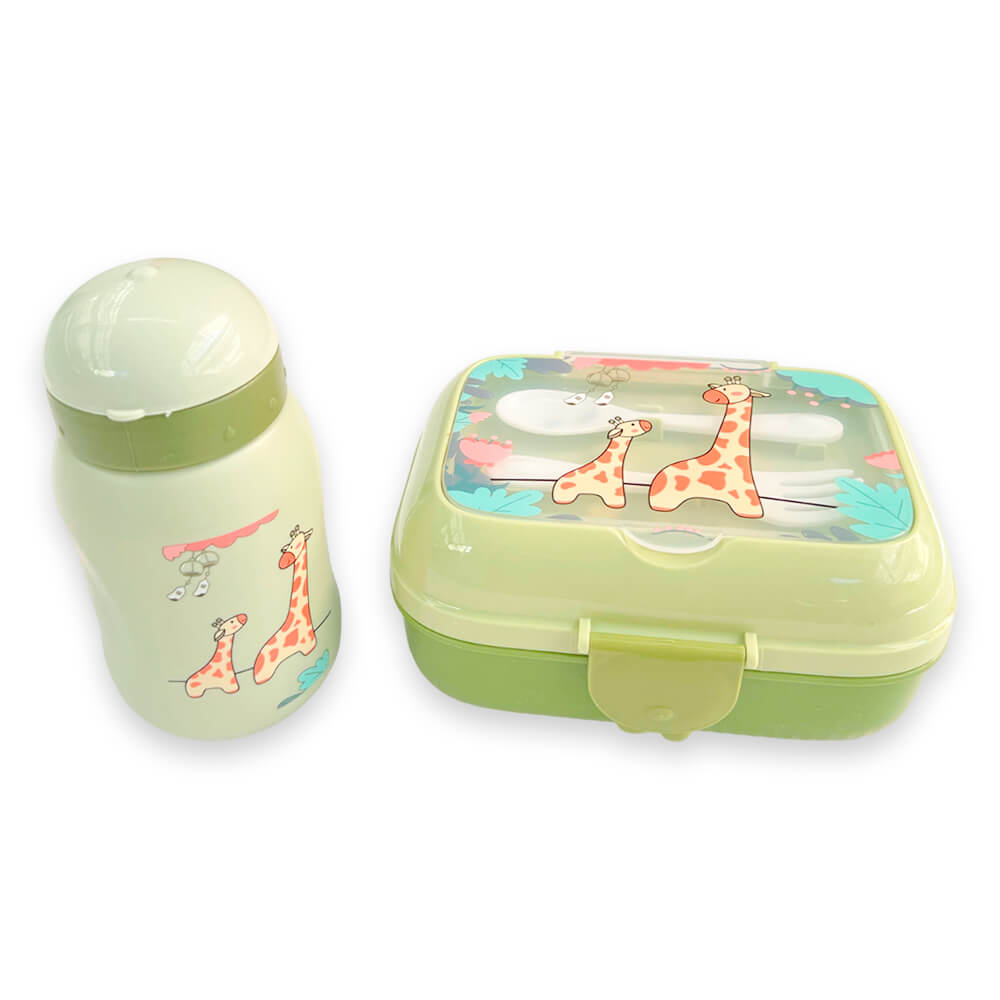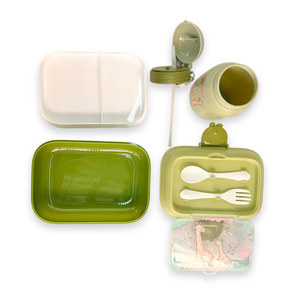 Su tapa traslúcida destaca con un hermoso estampado de animales en estilo kawaii, convirtiéndolo en un accesorio que refleja tu personalidad única. Además, incluye un práctico set de cubiertos (tenedor y cuchara) y un termo a juego, para que puedas disfrutar de tus bebidas favoritas junto con tus comidas, todo en un mismo lugar.