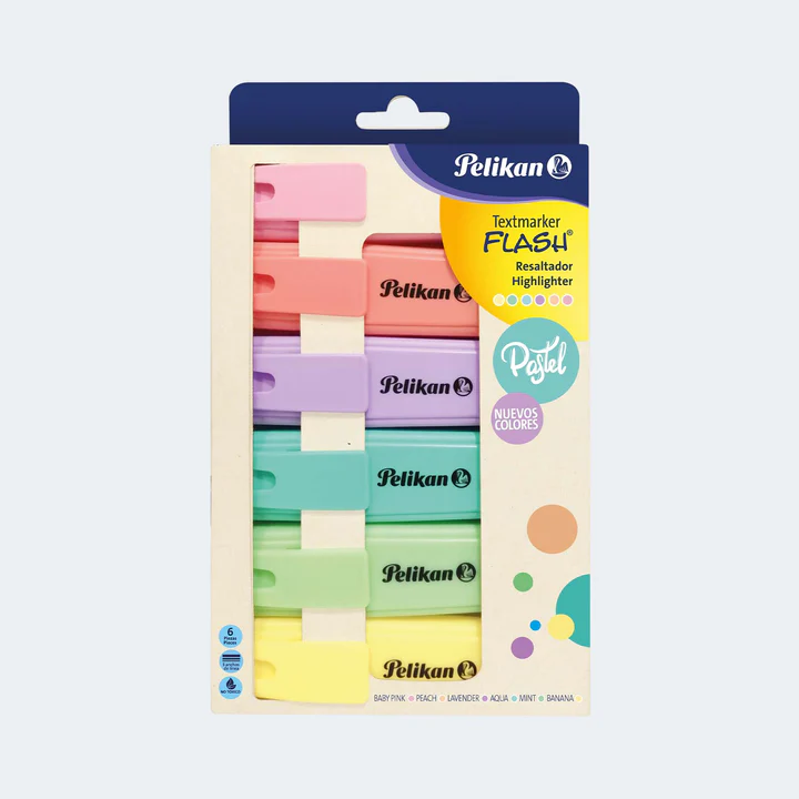 Caja con resaltadores pastel X6 punta gruesa marca PELIKAN. Útiles para resaltar y subrayar cualquier tipo de texto. Para uso escolar y en oficina. Raya casi todo tipo de superficie con tinta de calidad, muy resistente y duradero.
