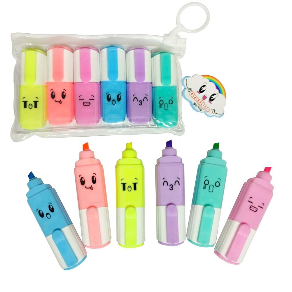 Set de resaltadores mini x6 en tonos pastel, colores : Rosa, Aguamarina, Amarillo, Azul, Morado, Fucsia