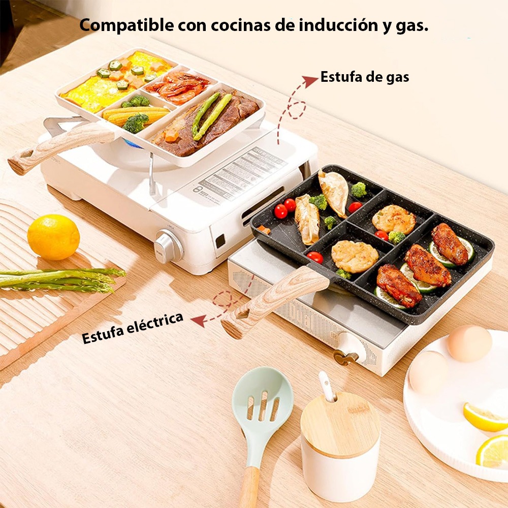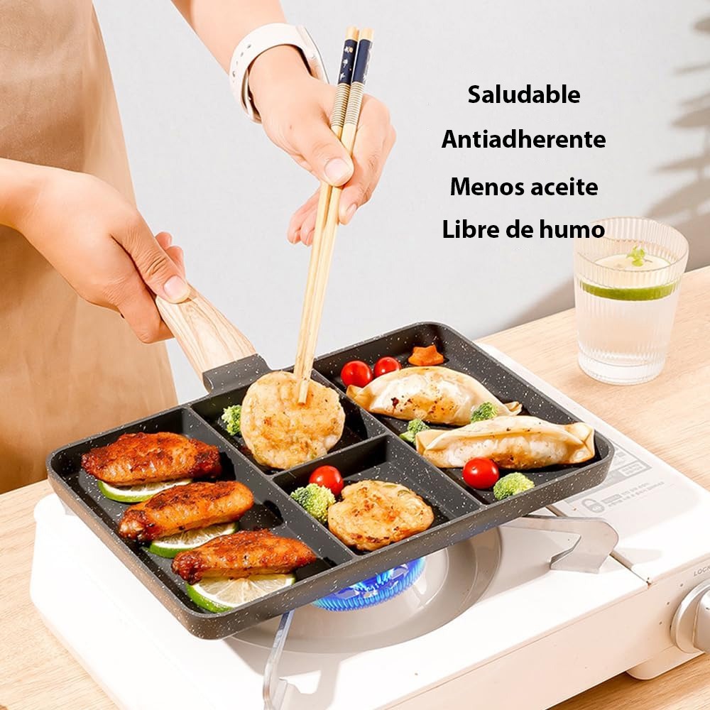 Multiplica tus Opciones Culinarias: Con sus 4 espacios individuales, este sartén te brinda la libertad de cocinar múltiples platillos simultáneamente. Ya sea que desees preparar un desayuno completo, salteados mixtos o cualquier otra combinación, ¡este sartén es tu aliado perfecto! Listo para el Uso Intensivo: Fabricado con aluminio de alta calidad, no solo garantiza una distribución uniforme del calor, sino que también está diseñado para resistir el uso constante sobre el fuego. Además, su recubrimiento antiadherente asegura que tus comidas se deslicen con facilidad y se limpie sin complicaciones.