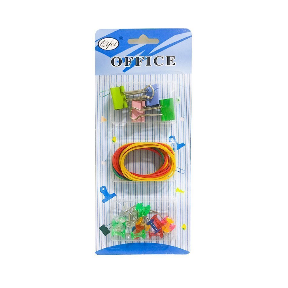 Estuche con set oficina que consta de ganchos loteros pequeños de colores buena calidad, chinchones de colores traslucidos y ligas de colores. Set oficina muy útil para archivo y la organización de documentos.