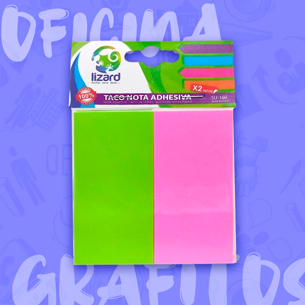 Taco de notas dividido en 2×100 de papel adhesivo de colores. Todo tipo de uso muy útil para escribir recordatorios, apuntes, mensajes, separar hojas etc. Calidad garantizada.