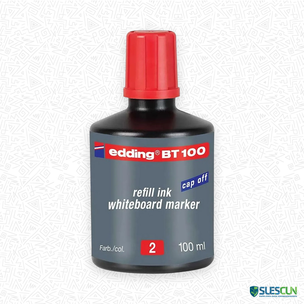 La Tinta Edding BT100 Roja es la solución inteligente para maximizar la eficiencia y reducir el consumo de plástico. Diseñada específicamente para el sistema BT100, esta recarga de tinta Edding roja devuelve la intensidad y la capacidad de marcaje a tus rotuladores Edding permanentes.